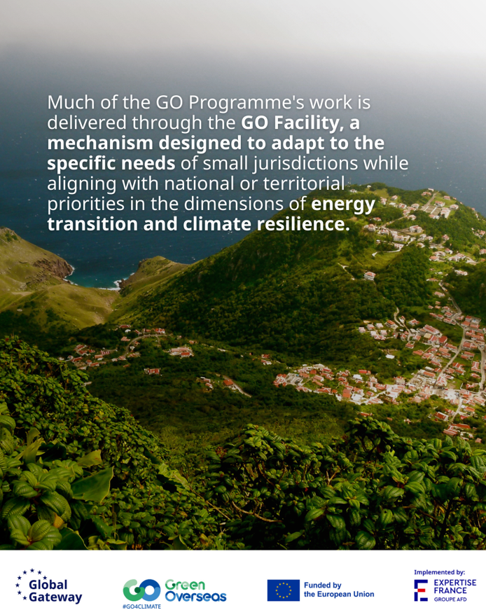 Part of the GO Programme's work is delivered through the GO Facility, a mechanism allowing each beneficiary territory to submit up to two strategic climate proposals. The Facility is deliberately flexible and highly targeted, designed to adapt to the specific needs of small jurisdictions while aligning with national or territorial priorities in the dimensions of energy transition and climate resilience.