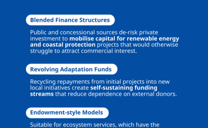 - Blended finance structures, where public and concessional sources de-risk private investment, are mobilising capital for renewable energy and coastal protection projects that would otherwise struggle to attract commercial interest.